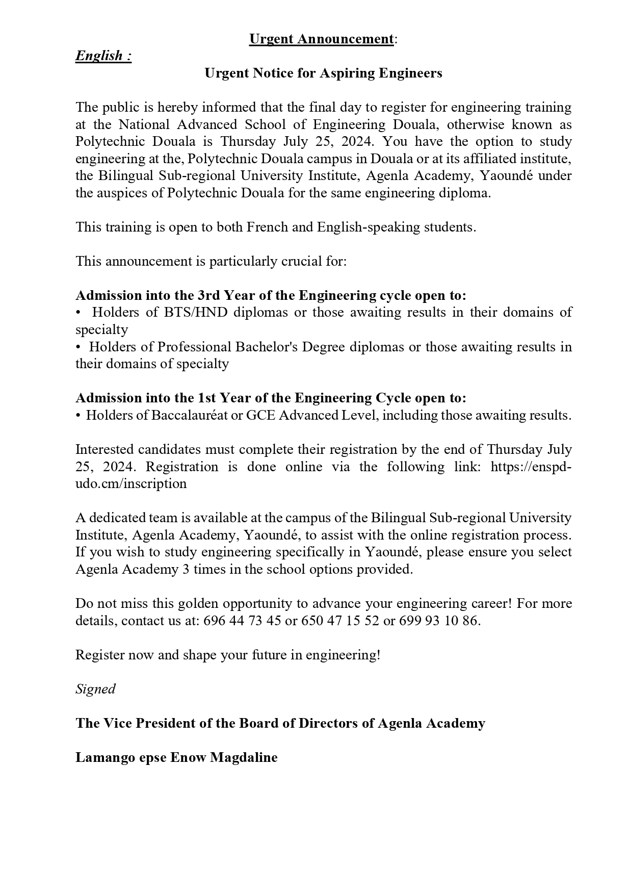 eninfos@agenlaacademy.com (+237) 6964473 45 - 650471552 - 699931086