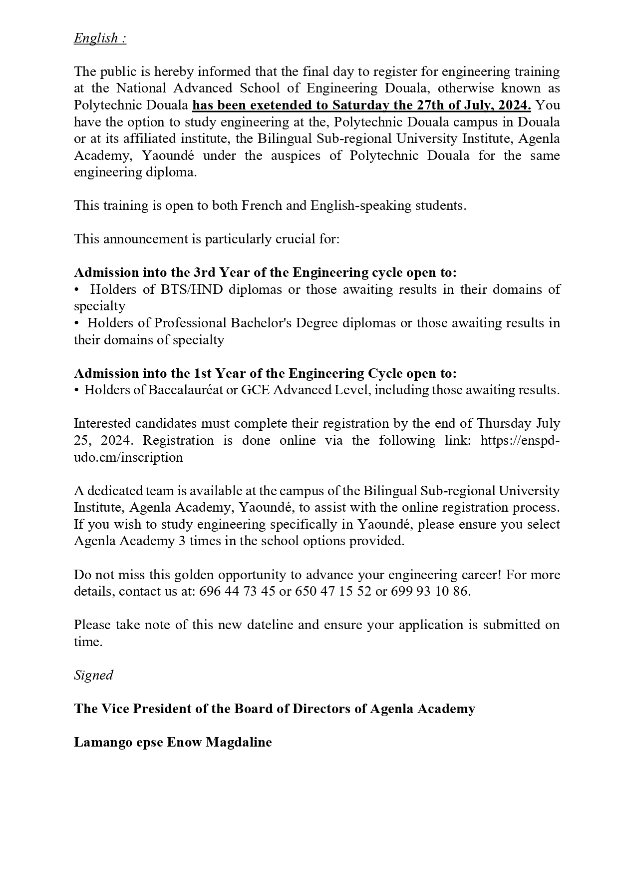 Polytechnic Douala has been exetended to Saturday the 27th of July, 2024. You